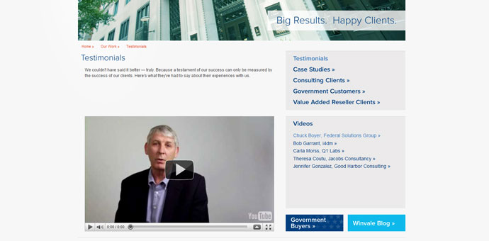 Testimonials page. This section features a custom JavaScript YouTube player we integrated with the CMS.